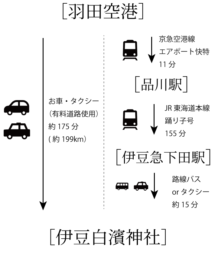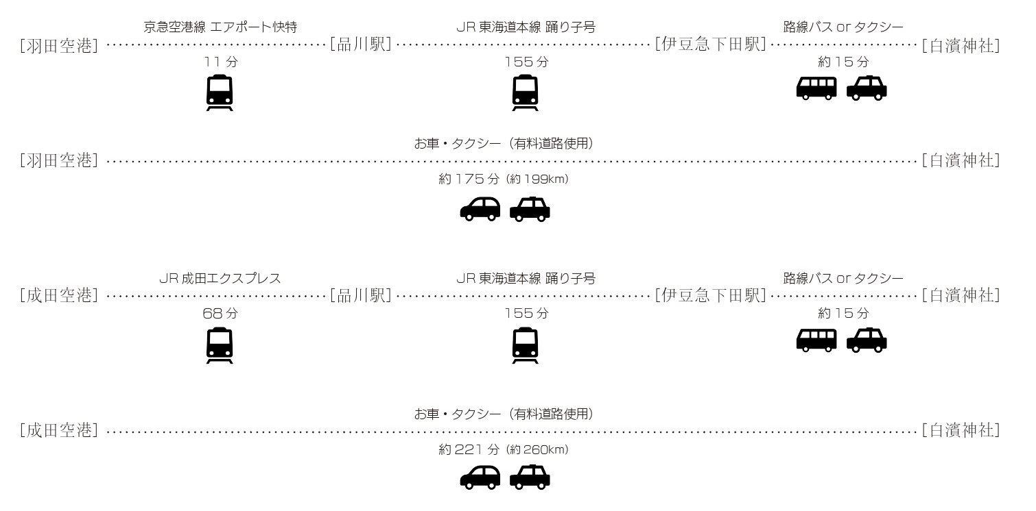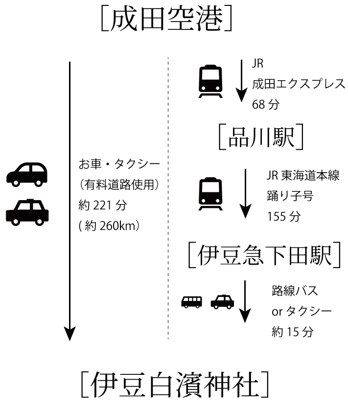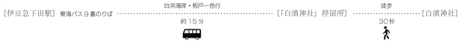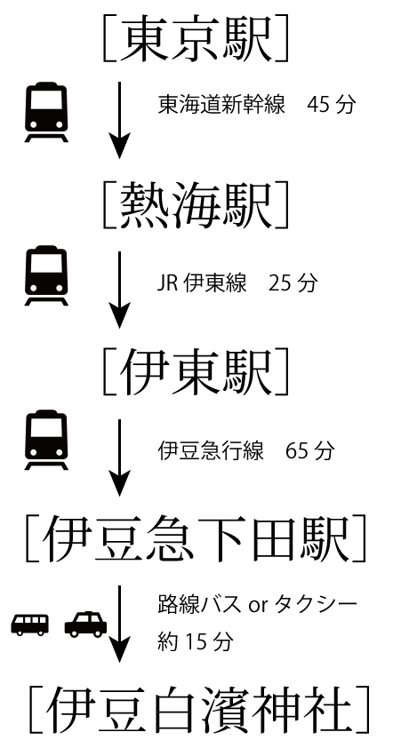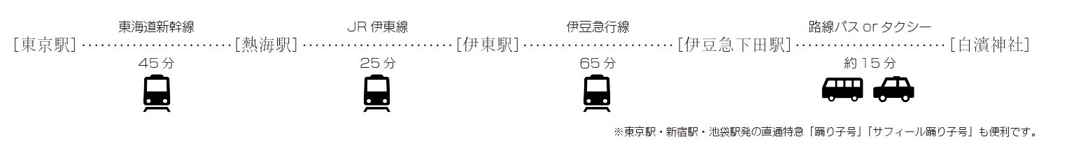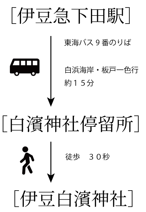 東京駅から直通特急で伊豆急下田駅まで二時間半。他、東海道線熱海駅より伊豆急線にて、伊豆急下田駅まで一時間半。下田駅からは、東海バスにて「白浜神社前」下車(約十分)。