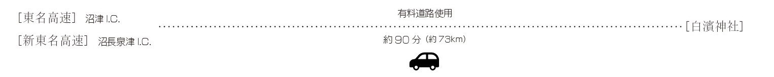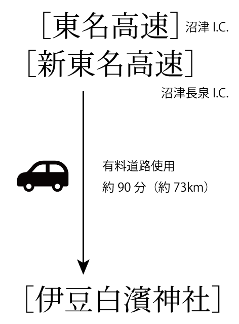 熱海から国道135号線を南下して、白浜まで約一時間半。また、東名沼津インター、新東名長泉沼津インターから南に伊豆縦貫自動車道等で約一時間半です。